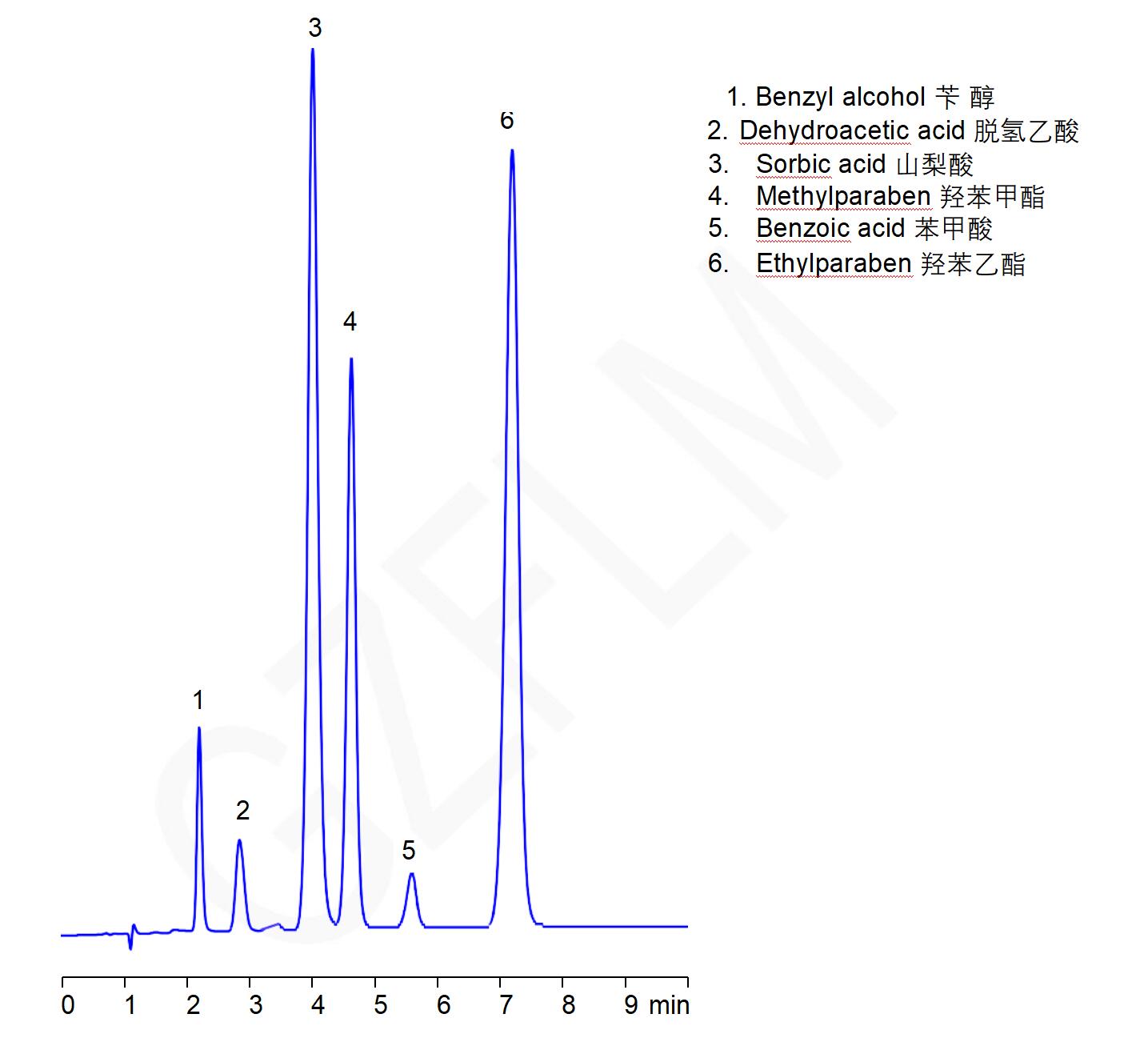 App ID: FLM-C230020 Comixsil HAX分析脫氫乙酸苯甲酸芐醇山梨酸羥苯甲酯等6種性質不同的防腐劑 1. Benzyl alcohol 芐 醇 2. Dehydroacetic acid 脫氫乙酸 3.Sorbic acid 山梨酸 4.Methylparaben 羥苯甲酯 5.Benzoic acid 苯甲酸 6.Ethylparaben 羥苯乙酯 Column:Comixsil HAX 3u 100*3.0mm (P/N:FMD-HAX3-YONU) Mobile phase: 乙腈:水:150mM 磷酸二氫銨 (pH 3.7) = 15:65:20 Flow rate: 0.6 ml/min Detection: 235 nm ![]() |