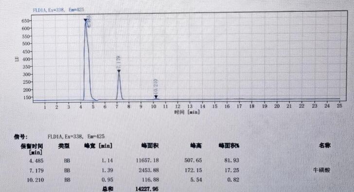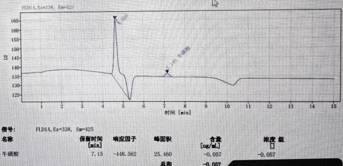 App ID: FLM-M240001 GB 5009.169-2016 食品中牛磺酸的測定 色譜柱:MARS MNa 5u,250*4.6mm(貨號:FMG-1036-EONU) 流動相:檸檬酸三鈉溶液(稱取19.6g 檸檬酸三鈉,加950mL 水溶解,加入1mL 苯酚,用硝酸調pH 至3.10-3.25, 經 0.45um 微孔濾膜過濾。 流速:0.4mL/min 熒光衍生溶劑流速:0.3mL/min 檢測波長:激發波長:338nm, 發射波長:425nm 柱溫:55℃ 柱后衍生系統:SSI Allchrom PCR6000 柱后衍生系統 檢測器:熒光檢測器進樣量:20ul 樣品: