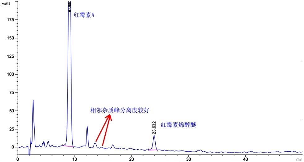 Titank C18 色譜柱分離度可達 20.19,拖尾因子 0.912,且對一些相鄰雜質(zhì)峰有更好的分離效果。
